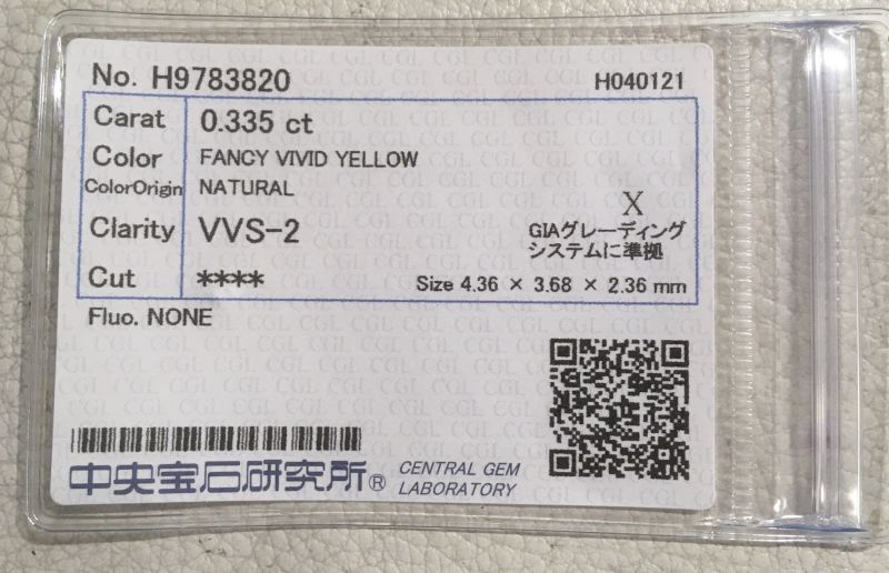 裸石 0.335ct Fancy Vivid Yellow VVS2 中央宝石研究所ソーティング付 [戻る]