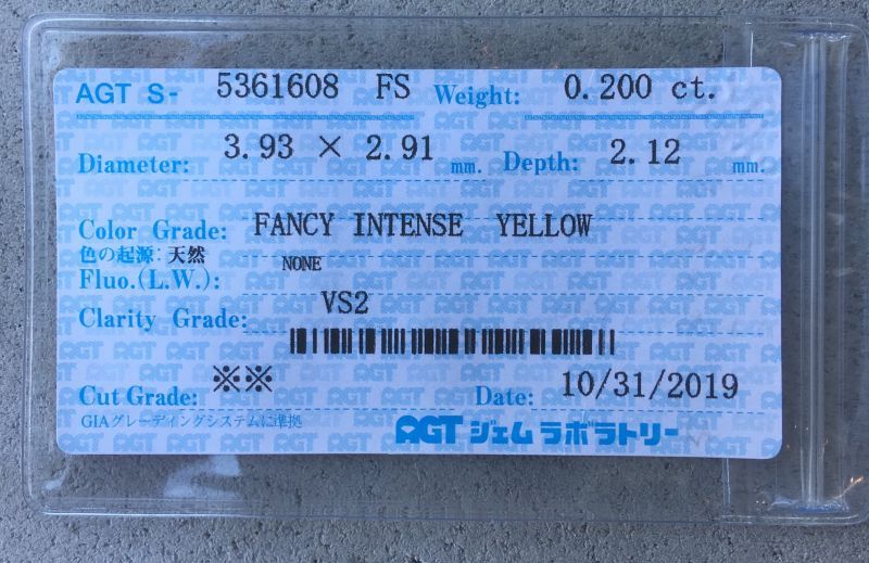 裸石 Fancy Intense Yellow 0.200ct VS-2 AGT ソーティング付き